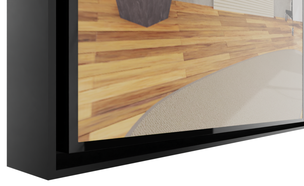 Der Rahmen hat eine Tiefe von 142 mm und kann auf eine Wand aufgesetzt oder in eine Wand eingebaut werden. Die sichtbare Kante ist 12 mm dünn. Als Material kommt MDF schwarz lackiert zum Einsatz.