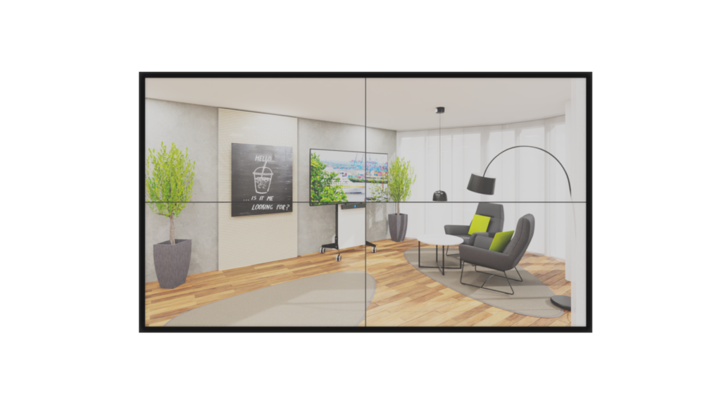 Bei den eingesetzten 55“ Displays kann gewählt werden zwischen professionellen 4K Signage Displays und professionellen 4K Videowalls. Die Videowalls haben einen kaum sichtbaren Rahmen von etwa 1,8 mm, was bei 2 aneinanderstoßenden Videowalls einen Steg von nur ca. 3,6 mm ausmacht.