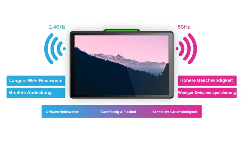 Das Display ist mit einem Dualband-Wifi-System ausgestattet und sorgt damit für eine Highspeed-Internetverbindung. Verabschieden Sie sich von frustrierenden Zwischenspeicherungen und endlosen Ladezeiten. Die 2,4-GHz- und 5-GHz-Frequenzen sorgen für eine nahtlose Konnektivität und ermöglichen Ihnen damit die Freiheit, Ihren Raum auf Ihre Weise zu buchen.